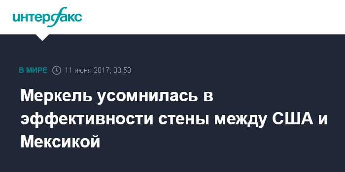 Москва. 11 июня. INTERFAX.RU - Канцлер Германии Ангела Меркель заявила, что возведение стены между США и Мексикой не решит проблем, вызванных иммиграцией, во время визита в Мехико. Как отмечает BBC, Меркель не упомянула президента США Дональда Трампа, который пообещал установить барьер через мексиканскую границу.