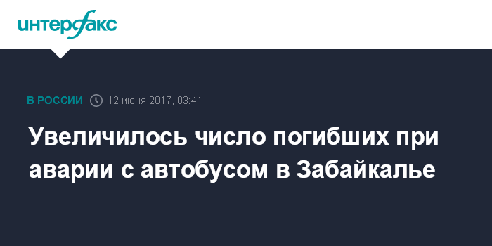 "12 июня 2017 года около 0 часов в Петровск-Забайкальском районе Забайкальского края на 702 километре трассы Иркутск-Чита опрокинулся автобус, в результате чего погибло по меньшей мере 11 человек. По данному факту следственными органами Следственного комитета Российской Федерации по Забайкальскому краю проводится доследственная проверка. К настоящему времени известно, что инцидент произошёл с автобусом марки KIA GRANBIRD, который съехал на обочину дороги и перевернулся. В результате 10 человек погибли на месте, в том числе 9 женщин и один мужчина. Ещё один пострадавший скончался при доставлении в больницу. Более 20 человек пострадали в результате ДТП", - говорится в сообщении.