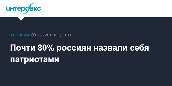 Москва. 12 июня. INTERFAX.RU - Доля россиян, называющих себя патриотами, выросла до 78% с 57% в декабре 2006 года, сообщает фонд "Общественное мнение". Не считают себя патриотами 16% респондентов (с 30% в 2006 году), показал опрос, проведенный 3-4 июня среди 1500 человек в 104 населенных пунктах 53 субъектов РФ.