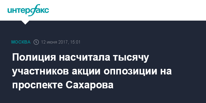Москва. 12 июня. INTERFAX.RU - Около тысячи человек принимают участие в акции оппозиции на проспекте Сахарова в Москве, сообщает пресс-служба столичного ГУ МВД.