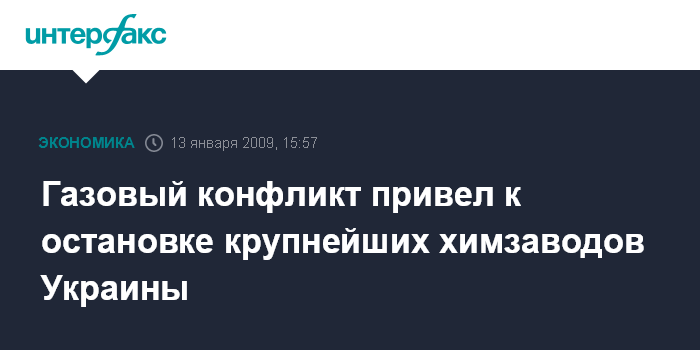 Москва. 13 января. INTERFAX.RU - Крупнейшие украинские предприятия химической отрасли остановили работу в связи с прекращением Россией поставок природного газа в Украину, этом сообщил министр промышленной политики Украины Владимир Новицкий журналистам в Киеве во вторник.