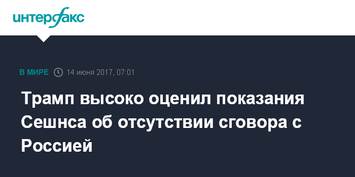 Москва. 14 июня. INTERFAX.RU - Президент США Дональд Трамп высоко оценил показания министра юстиции США Джеффа Сешнса в конгрессе, сообщила представитель Белого дома Сара Сандерс.