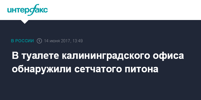 Как рассказала "Интерфаксу" пресс-секретарь Калининградского зоопарка Екатерина Михайлова, в зоосад позвонили испуганные сотрудники офиса, расположенного в центре города на первом этаже высотного жилого здания, и сообщили об обнаружении в туалете офиса питона. Прибывшие на место герпетологи отловили животное и отправили его в зоопарк.
