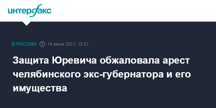 Москва. 14 июня. INTERFAX.RU - Апелляционные жалобы на изменение меры пресечения бывшему губернатору Челябинской области Михаилу Юревичу и на арест его имущества направлены в суды. Об этом сообщил агентству "Интерфакс" адвокат Юревича Игорь Трунов.