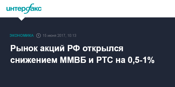 Москва. 15 июня. INTERFAX.RU - Рынок акций РФ открылся в четверг снижением рублевых цен blue chips на фоне негативных внешних факторов, а также известий об ужесточении США антироссийских санкций; индексы ММВБ и РТС за минуту торгов потеряли 0,5-1%, причем последний откатился к рубежу 1000 пунктов. К 10:01 МСК индекс ММВБ составил 1829,69 пункта (-0,5%) - минимум с конца марта 2016 года, индекс РТС - 1003,3 пункта (-1%) - минимум с ноября 2016г; рублевые цены большинства основных "фишек" на Московской бирже снизились в пределах 2,5%.