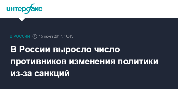 Москва. 15 июня. INTERFAX.RU - Большинство россиян, как и прежде, уверены, что РФ должна продолжать свою политику, невзирая на западные санкции - сейчас так считают 70% респондентов против 65% в ноябре 2015 года, сообщили "Интерфаксу" в "Левада-Центре".