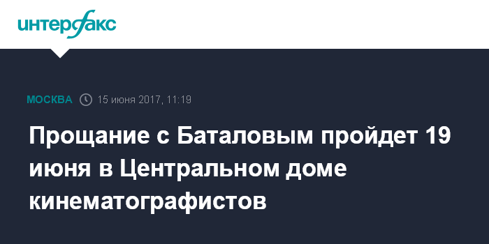 "Прощание с Алексеем Баталовым состоится в Большом зале Центрального дома кинематографистов в понедельник 19 июня. По адресу Васильевская, 13. Похороны - на Преображенском кладбище", - рассказали "Интерфаксу" в ЦДК в четверг.