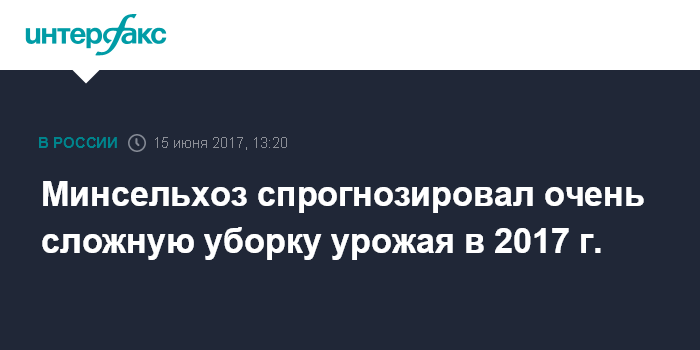 Москва. 15 июня. INTERFAX.RU - Минсельхоз РФ прогнозирует очень сложную уборку урожая в этом году. Сбор зерна может быть менее 100 млн тонн.