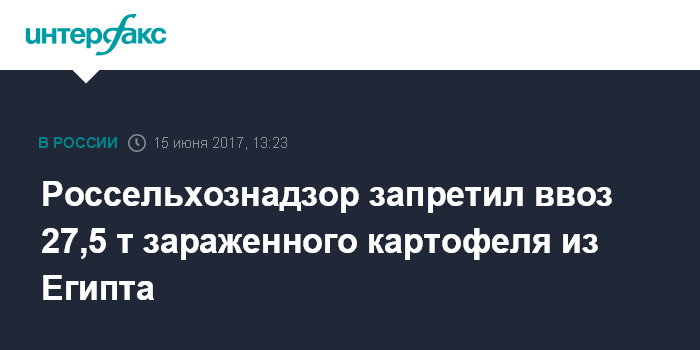 Москва. 15 июня. INTERFAX.RU - Россельхознадзор запретил ввоз в РФ партию картофеля из Египта весом 27,5 тонны. Об этом говорится в сообщении управления Россельхознадзора по Краснодарскому краю и Республике Адыгея.