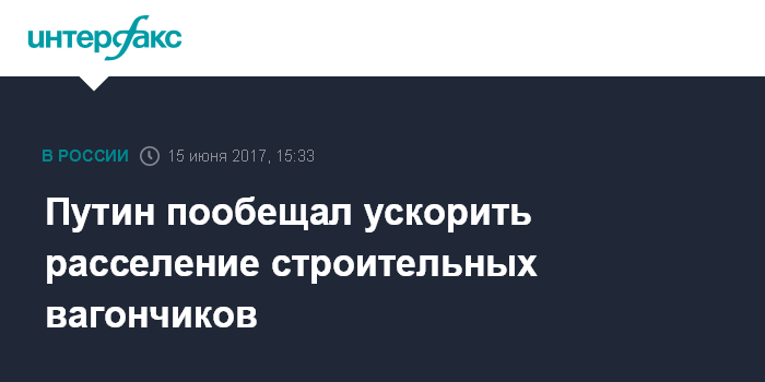 Москва. 15 июня. INTERFAX.RU - Президент России Владимир Путин в ходе "Прямой линии" пообещал ускорить реализацию программы расселения граждан из "вагонных городков".