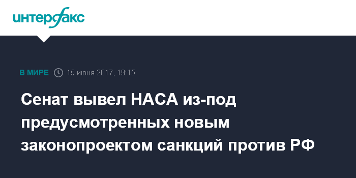 Москва. 15 июня. INTERFAX.RU - Сенат США одобрил поправку в законопроект о санкциях в отношении Ирана и России, который выводит НАСА из-под действия санкций.
