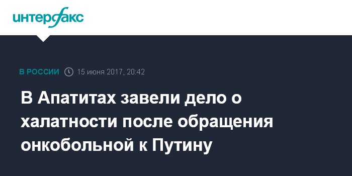 Москва. 15 июня. INTERFAX.RU - Следователи СУ СКР по Мурманской области возбудили уголовное дело по статье "халатность" после обращения онкобольной жительницы Апатитов во время "прямой линии" с президентом России Владимиром Путиным.