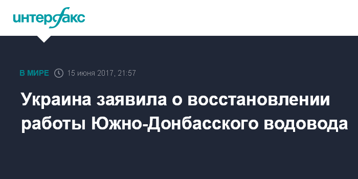 Москва. 15 июня. INTERFAX.RU - Южно-Донбасский водовод, работа которого ранее была нарушена вследствие обстрела, в четверг восстановил работу после восстановительных мер. Об этом сообщает украинская сторона Совместного центра по координации и контролю (СЦКК).