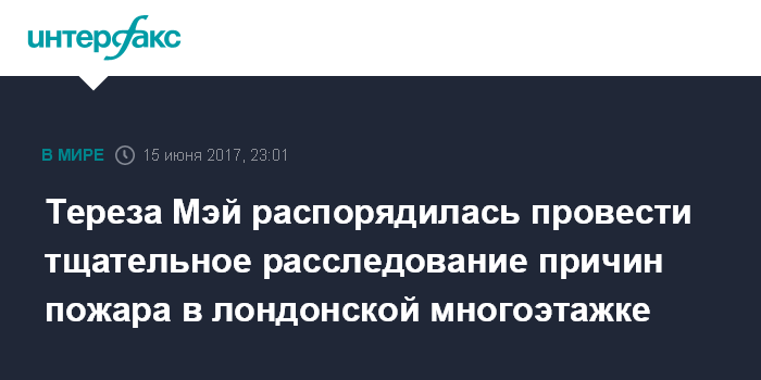 Москва. 15 июня. INTERFAX.RU - Премьер-министр Великобритании Тереза Мэй распорядилась провести всеобъемлющее расследование пожара в лондонской высотке, сообщает в четверг телерадиокорпорация "Би-би-си".