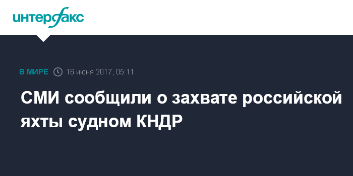 Москва. 16 июня. INTERFAX.RU - Представительство МИД РФ во Владивостоке проверяет сообщение о том, что российскую яхту в Японском море, предположительно, захватило северокорейское судно.