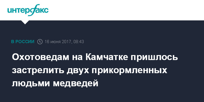 Москва. 16 июня. INTERFAX.RU - Специалисты охотназдора на Камчатке убили двух медведей, проявивших агрессию к людям, сообщает в пятницу агентство лесного хозяйства и охраны животного мира региона. "Ликвидированы животные, прикормленные "сердобольными" гражданами на 126-м км трассы Петропавловск-Камчатский - Мильково", - говорится в сообщении.