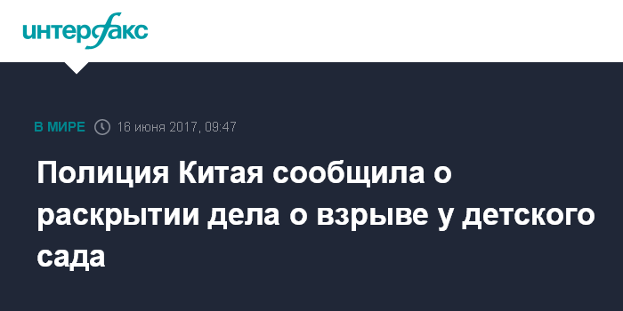 Москва. 16 июня. INTERFAX.RU - Китайская полиция сообщила о раскрытии дела о взрыве у детского сада, произошедшего в четверг в уезде Фэнсянь восточной китайской провинции Цзянсу, сообщило центральное телевидение Китая.