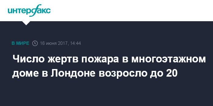 Москва. 16 июня. INTERFAX.RU - По меньшей мере 20 человек погибли в результате пожара, произошедшего в многоэтажном жилом доме в британской столице, сообщает в пятницу газета Daily Mirror.