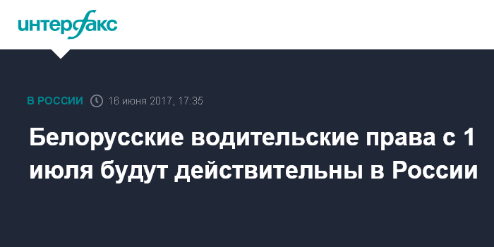Москва. 16 июня. INTERFAX.RU - Белорусские водительские права смогут использоваться на территории России с 1 июля, заявил премьер РФ Дмитрий Медведев.