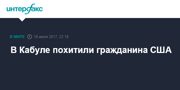 Москва. 18 июня. INTERFAX.RU - Гражданин США похищен в воскресенье из своего дома в районе Картае-Чар Кабула, сообщил телеканал Tolo со ссылкой на высокопоставленного правительственного чиновника.