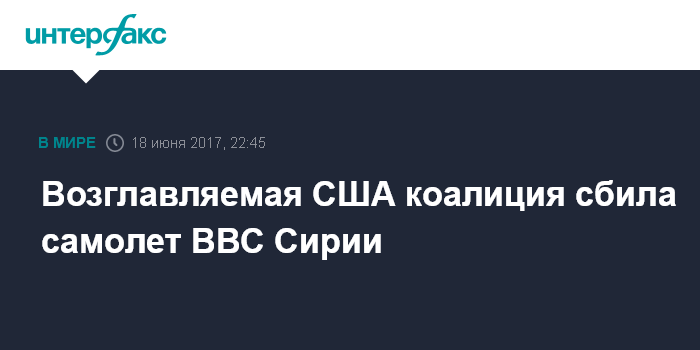 Москва. 18 июня. INTERFAX.RU - Коалиция во главе с США по борьбе против террористической группировки ИГ (запрещена в РФ) сбила самолет ВВС Сирии, сообщают в воскресенье западные СМИ со ссылкой на заявление сирийского военного командования.