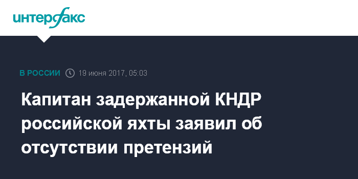 Москва. 19 июня. INTERFAX.RU - Капитан российской яхты "Katalexa" Александр Сидоренко, которую на прошлой неделе по недоразумению задержали пограничники КНДР, считает инцидент исчерпанным и не имеет претензий к северокорейской стороне. Накануне яхта вернулась во Владивосток.