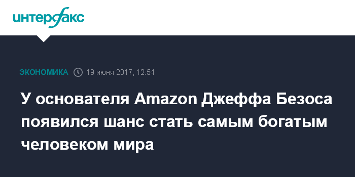 Москва. 19 июня. INTERFAX.RU - Основатель и гендиректор Amazon Джефф Безос может стать самым богатым человеком в мире, поскольку цена акций его компании заметно выросла после объявления о покупке Whole Foods, сообщает CNN Money.