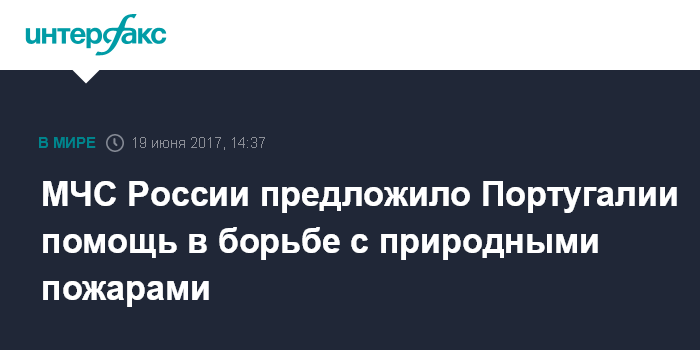 Москва. 19 июня. INTERFAX.RU - Глава МЧС России Владимир Пучков направил министру внутренней администрации Португалии Констанце Урбану де Соузе телеграмму, в которой выразил свои соболезнования и готовность помочь в борьбе с природными пожарами, сообщили "Интерфаксу" в пресс- службе министерства.