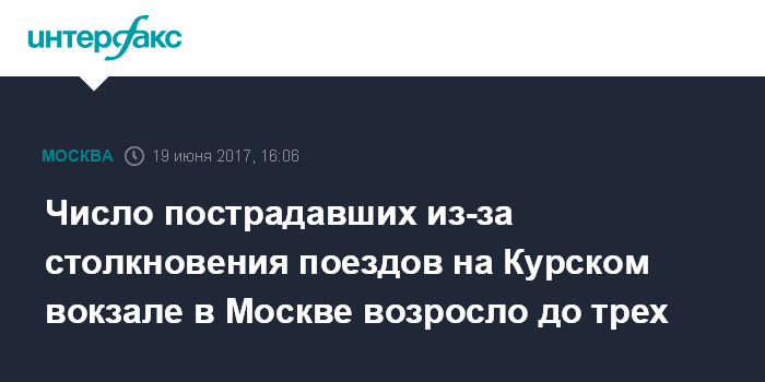 Москва. 19 июня. INTERFAX.RU - Число пострадавших в результате столкновения поезда с электричкой на Курском вокзале в Москве возросло до трех человек, сообщил "Интерфаксу" осведомленный источник.