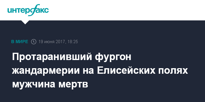 Москва. 19 июня. INTERFAX.RU - Мужчина, протаранивший на автомобиле фургон жандармерии на Елисейских полях, погиб, сообщает сайт журнала "Пуэн" со ссылкой на находящегося на месте событий корреспондента.