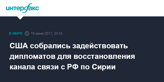 Москва. 19 июня. INTERFAX.RU - США намерены по дипломатическим и военным каналам работать с Россией с тем, чтобы восстановить канал связи по предотвращению инцидентов в Сирии, заявил глава Объединенного комитета начальника штабов Джозеф Данфорд.