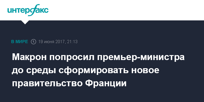 Москва. 19 июня. INTERFAX.RU - Президент Франции Эмманюэль Макрон поручил премьеру Эдуару Филиппу сформировать новое правительство страны, сообщают в понедельник парижские СМИ со ссылкой на Елисейский дворец.