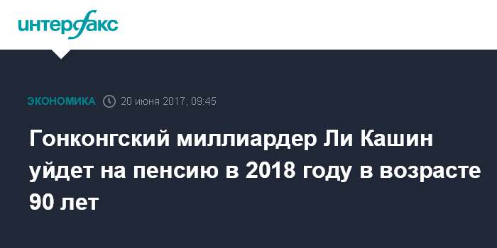 Москва. 20 июня. INTERFAX.RU - Самый богатый человек в Гонконге Ли Кашин намерен уйти в отставку с поста председателя совета директоров созданной им инвесткомпании CK Hutchison Holdings Ltd в 2018 году, сообщает The Wall Street Journal со ссылкой на источник в близком окружении инвестора.