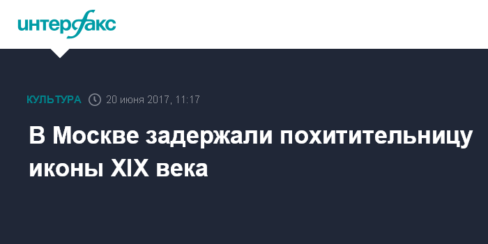 Москва. 20 июня. INTERFAX.RU - Женщина, укравшая в апреле из храма Пимена Великого в Тверском районе Москвы икону XIX века, задержана, сообщила официальный представитель МВД РФ Ирина Волк.