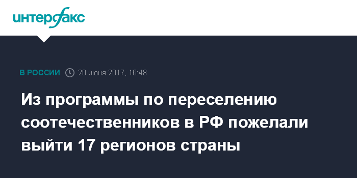 Москва. 20 июня. INTERFAX.RU - Семнадцать субъектов РФ в 2017 году попросили правительство вывести их из государственной программы по содействию добровольному переселению в Россию соотечественников. Об этом сообщил замглавы МВД РФ Александр Горовой.