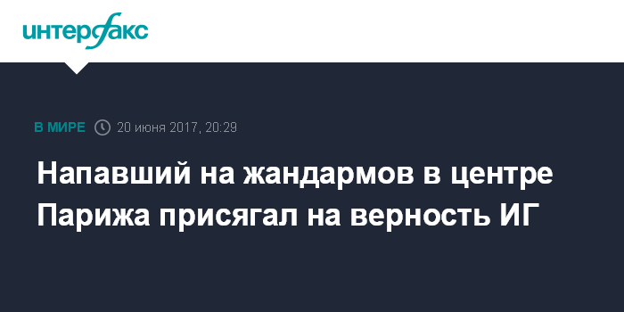 Москва. 20 июня. INTERFAX.RU - Мужчина, протаранивший в понедельник на автомобиле фургон жандармерии на Елисейских полях в Париже, оставил предсмертную записку, в которой присягает на верность террористической группировке ИГ (запрещена в РФ). Об этом сообщает во вторник газета Le Figaro со ссылкой на знакомый с ходом расследования источник.