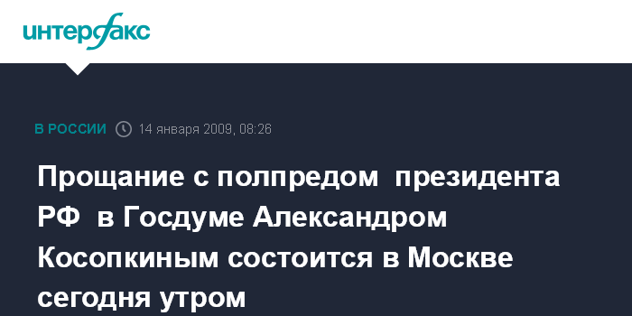 Москва. 14 января. INTERFAX.RU - Утром в среду депутаты до начала заседания Государственной думы попрощаются с погибшим в авиакатастрофе на Алтае полпредом президента РФ в нижней палате парламента Александром Косопкиным.