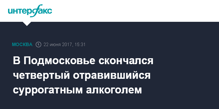 Москва. 22 июня. INTERFAX.RU - Количество жертв отравления метиловым спиртом в Сергиевом Посаде возросло до четырех человек, сообщила представитель подмосковного главка СКР Елена Фокина.