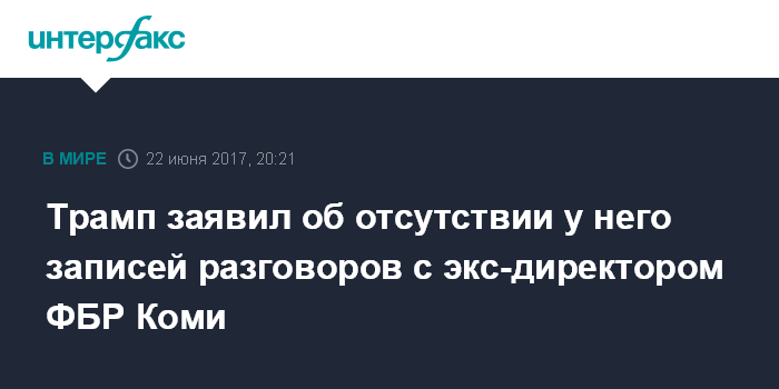 Москва. 22 июня. INTERFAX.RU - Президент США Дональд Трамп заявил в четверг, что не располагает записями своих разговоров с бывшим главой ФБР Джеймсом Коми.