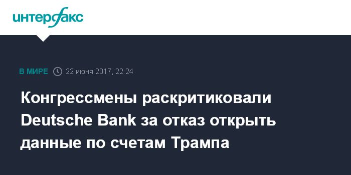 Как сообщалось, в мае конгрессмены попросили банк предоставить им внутренние документы о его действиях в период скандала с "зеркальными сделками" в РФ. Авторов запроса интересовало, были ли кредиты, предоставленные банком Трампу за несколько лет до начала президентской избирательной кампании", выданы под гарантии российского правительства или как-то связаны с Россией".