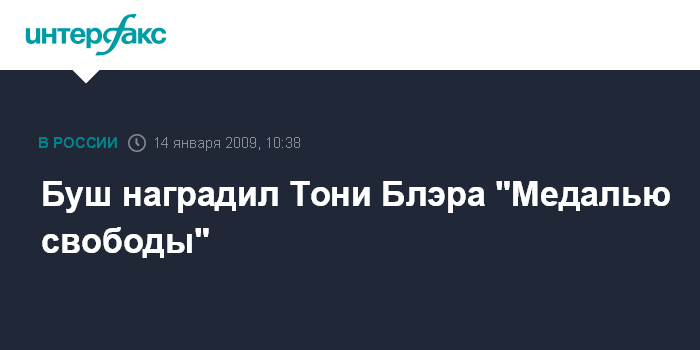 Москва. 14 января. INTERFAX.RU - Бывший премьер-министр Великобритании Тони Блэр награжден высшей наградой США для гражданских лиц - "Медалью свободы", сообщает британская телерадиокорпорация Би-би-си.