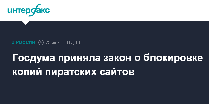 Москва. 23 июня. INTERFAX.RU - Госдума в пятницу приняла в третьем, окончательном чтении закон о блокировке так называемых "зеркал" пиратских сайтов в интернете. Инициатива, внесенная правительством, направлена на пресечение нелегального распространения и использования аудиовизуальных произведений в интернете.