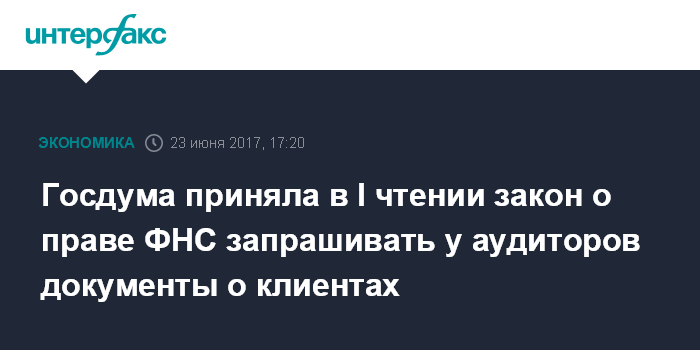 Москва. 23 июня. INTERFAX.RU - Госдума приняла в первом чтении законопроект о предоставлении налоговым органам права запрашивать у аудиторов информацию об их клиентах.