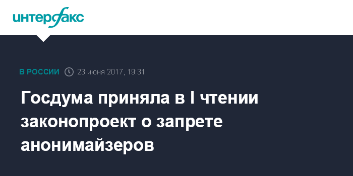 Москва. 23 июня. INTERFAX.RU - Госдума в пятницу приняла в первом чтении законопроект о запрете в России использовать средства для обхода блокировок для доступа к запрещенным сайтам, так называемые анонимайзеры.