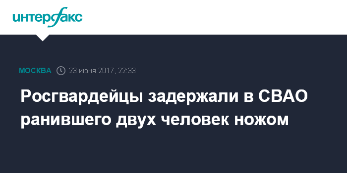 Москва. 23 июня. INTERFAX.RU - Сотрудники Росгвардии задержали в Северо-Восточном административном округе столицы подозреваемого в нападении на нескольких человек, двух из которых он ранил ножом, сообщили в пятницу "Интерфаксу" в столичном Главке Росгвардии.