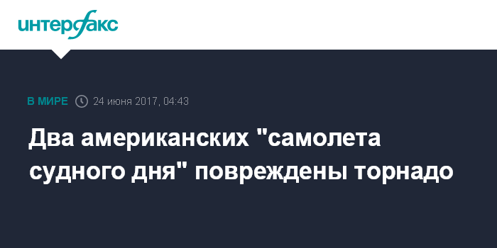 Москва. 24 июня. INTERFAX.RU - Два самолета E4-B Boeing 747s ВВС США, которые получили название "самолет судного дня", и практически являются мобильными "ядерными чемоданчиками", получили повреждения на авиабазе "Оффут" в штате Небраска в результате торнадо 16 июня, сообщил представитель командования ВВС Соединенных Штатов полковник Пэт Райдер.
