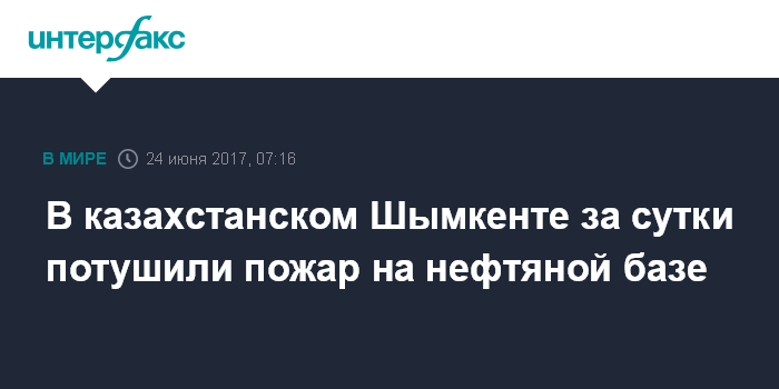 Москва. 24 июня. INTERFAX.RU - В Шымкенте (адмцентр Южно-Казахстанской области) ликвидирован пожар на нефтяной базе АО "Шымкент мунай онемдеры", сообщила в субботу агентству "Интерфакс-Казахстан" главный специалист областного департамента по ЧС Зарипа Турусбекова.