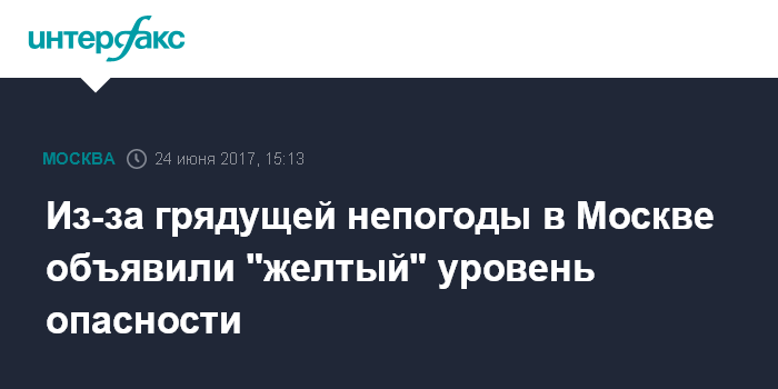 Москва. 24 июня. INTERFAX.RU - Гидрометцентр России предупредил москвичей о "желтом" уровне погодной опасности в воскресенье.