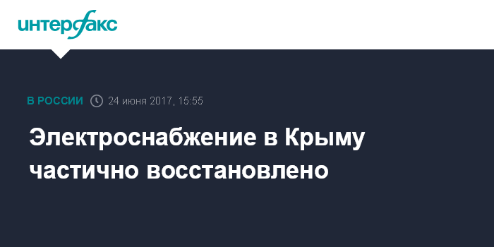 Москва. 24 июня. INTERFAX.RU - Электроснабжение в Крыму, нарушенное в ночь на субботу из-за плохой погоды, частично восстановлено, без света остаются более двух тысяч человек, сообщает пресс-служба крымского управления МЧС.
