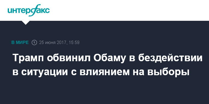 Москва. 25 июня. INTERFAX.RU -- Бывший президент США Барак Обама знал о возможном "вмешательстве РФ" в американские выборы задолго до того, как они состоялись, но ничего не предпринял в связи с этим, заявил американский президент Дональд Трамп.